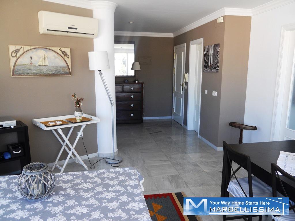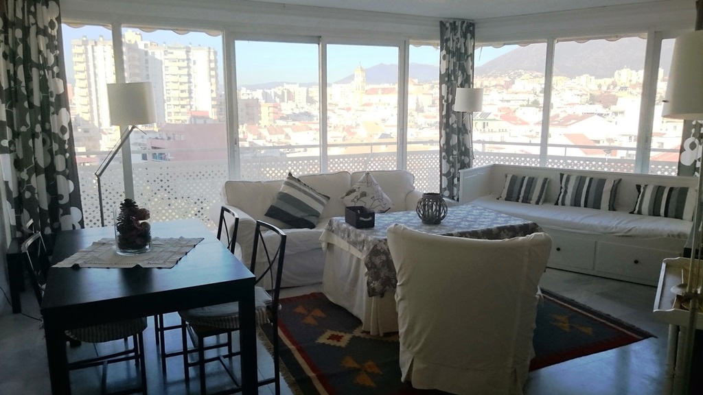 Second line beach in Marbella city. This beautiful apartment offers an entrance hallway, a living-dining room, two bedrooms, two bathrooms (main in suite), furnished and fully equipped kitchen, West facing terrace with side view to the sea, to the city and the mountain. Private underground garage, air conditioning hot and cold, elevators, concierge service during the days of the week. Just steps from the beach, bus stop, taxis stop and all kinds of services and entertainment. Conditions: Fortnight in June: €2600. Fortnight in July: €2900. Fortnight in August: €3200. Damage deposit: €400. To book: 50%. Departure cleaning: €90. If you exceed abusively consuming water or light will be deducted from the deposit.
