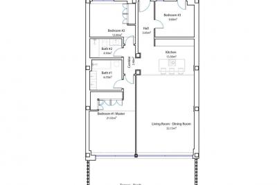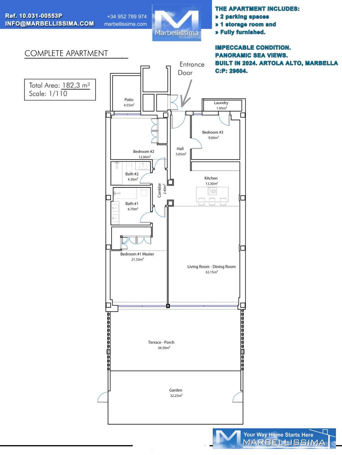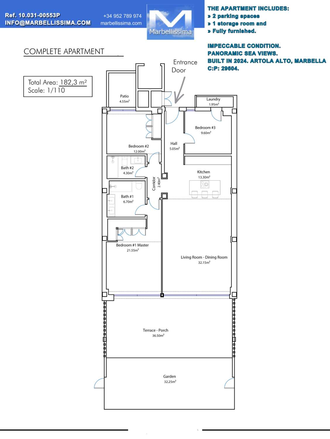 3-bedroom and 2 bathrooms, and is located on the ground floor with private garden of 42 m2, and comprises of an entrance hallway of 5.05 m2, a living-dining room of 31.15 m2, Kitchen of13.30 m2, corridor of 2.40 m2, master bedroom of 21.55 m2, second bedroom of 12 m2, third bedroom of 9.60 m2, master ensuite bathroom of 6.70 m2, second bathroom of 4.30 m2, utility room of 1.95 m2, patio of 4.55 m2, a terrace-porch of 36.50 m2, private garden of 32.25 m2. Total built area of 182.30 m2. Two private garage and 1 storage room completes this awe-inspiring property.