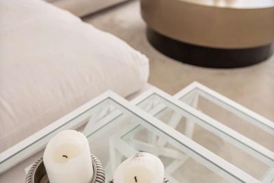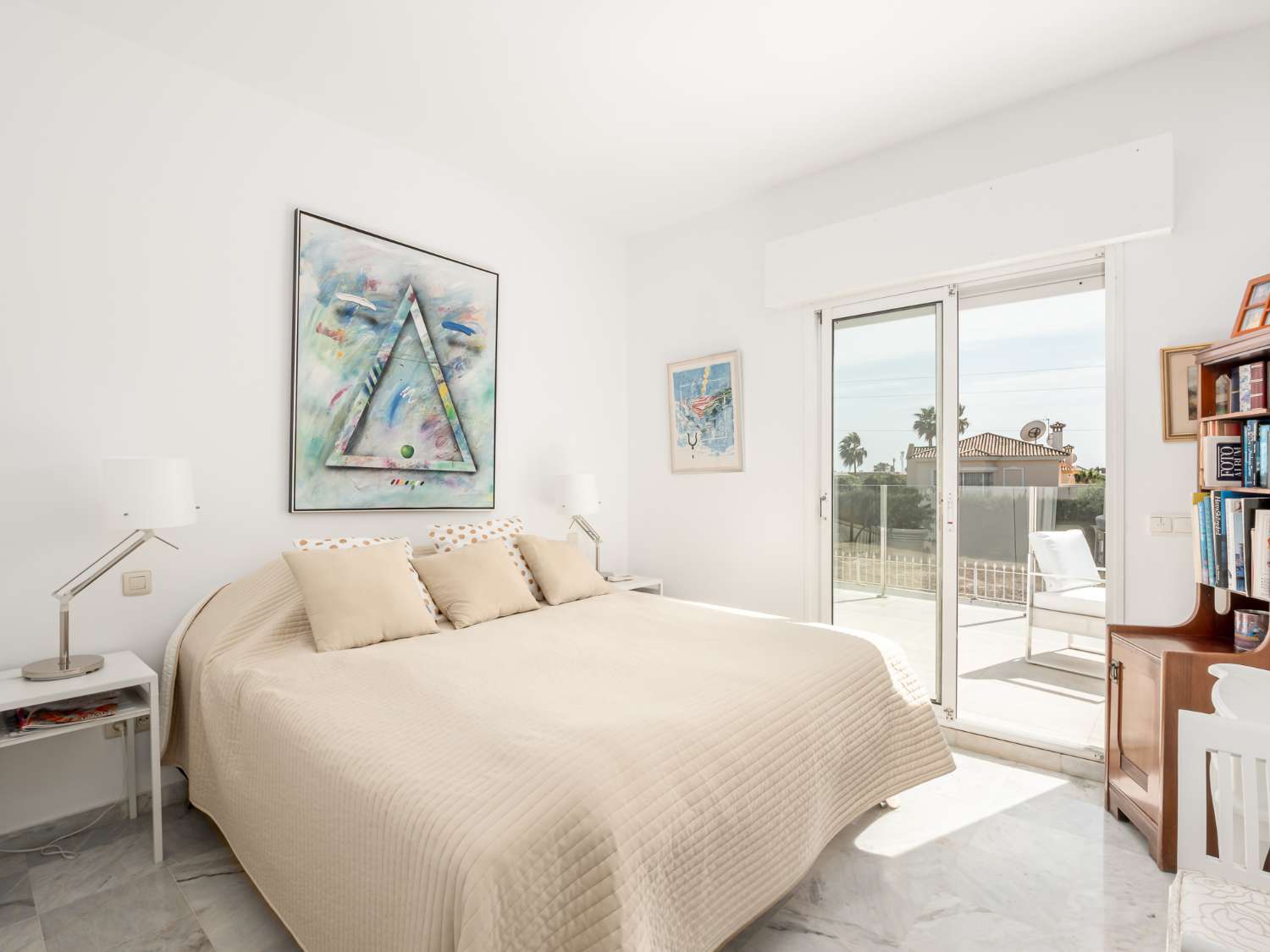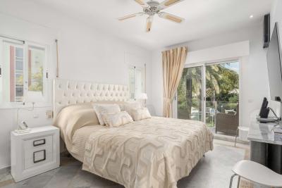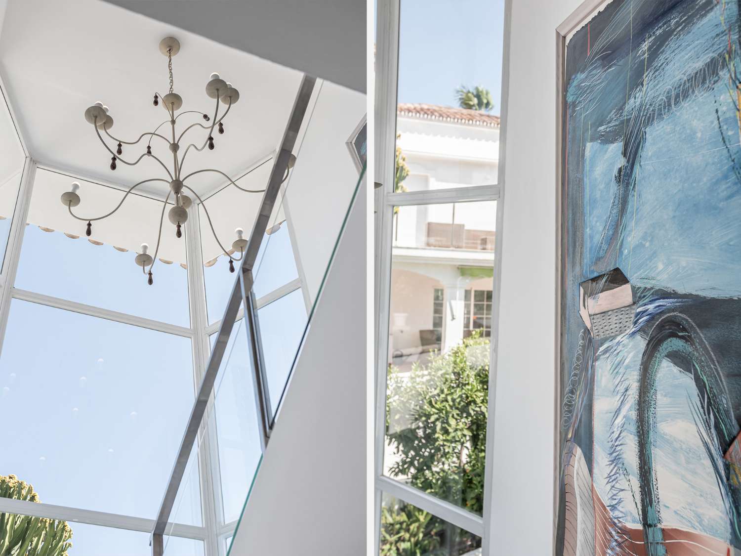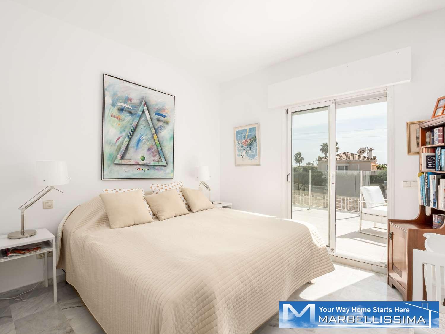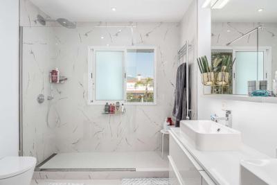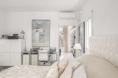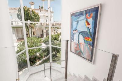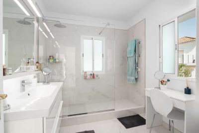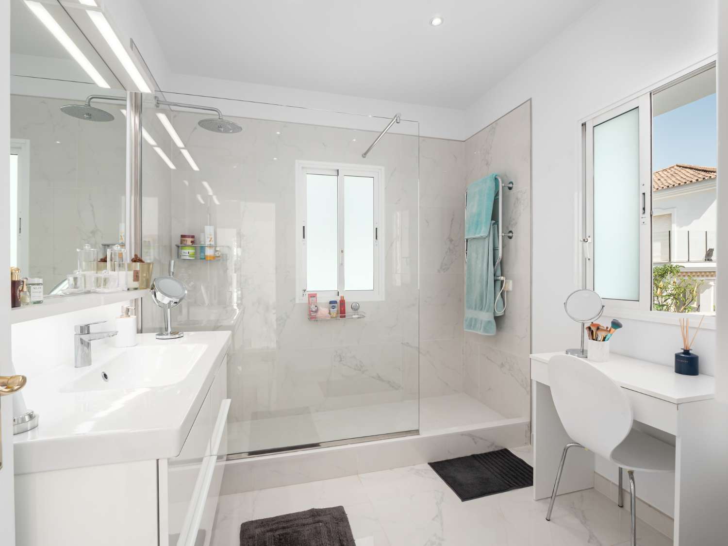 The marble stairs with glass and safety handrail, lavish a fresh appearance. As you go up the stairs you get inspired by the bay window that fills the room with extra natural light. The upper floor has the master en-suite bedroom with terrace overlooking common pool and gardens, a walk-in-closets with door access to a large terrace with views over its own heated pool and Jacuzzi, an en-suite spacious bathroom with massage shower where you can relax after a long day. Further more two additional bedrooms both exposure access to the same sunny large terrace and one share shower bathroom.