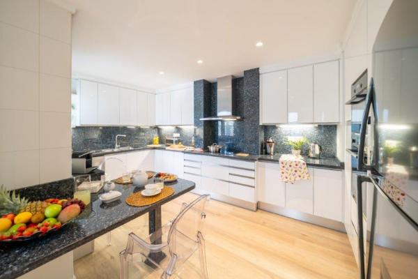The property has 350 m2, and enjoys an entrance hallway, which invites you to the living room with sofas, side tables, wall art, elegant lamps, dining area with capacity for 8 diners, ceiling lamp, sideboard, wall painting, giving sophistication and warmth touch to this space. The kitchen is full of small and large appliances, access to the laundry area.