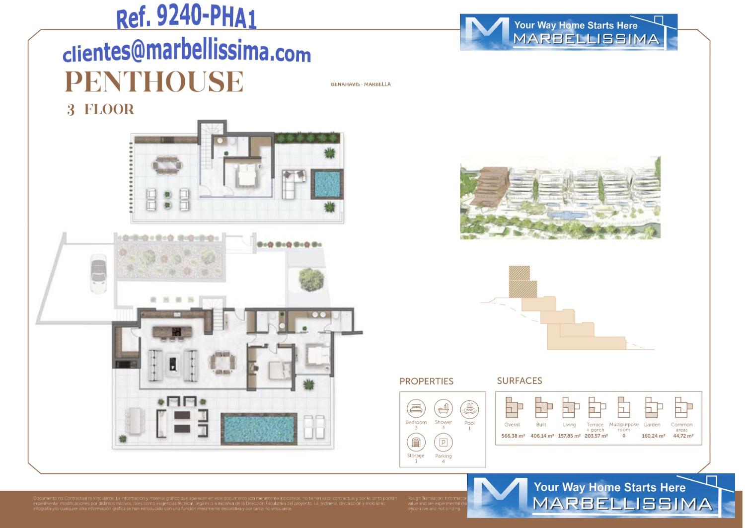 Overall: 566.38 sq m - Built: 406,14 sq m - Living area: 157,85 sqm - Terrace plus porch: 203,57 sqm - Garden area: 160,24 sq m - Common area: 44,72 sq m.