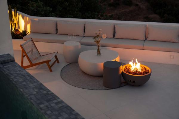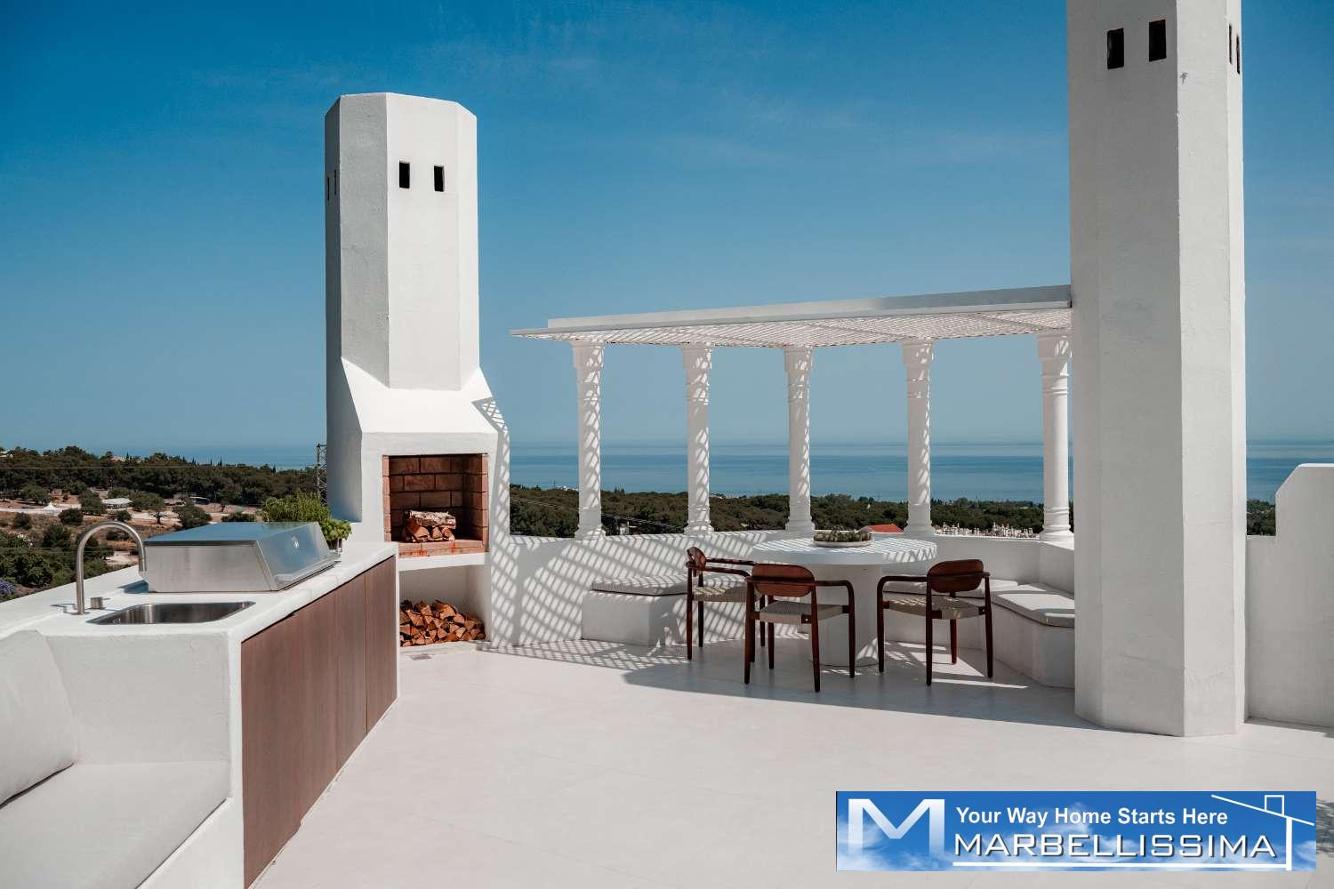 The upper floor is made for enjoying the landscape and climate. An immense terrace with a barbecue, bar, sunbeds, outdoor shower, and an infinity pool with overwater sunbeds, all with panoramic sea views. Plus, a third en-suite bedroom that offers complete privacy for guests.
