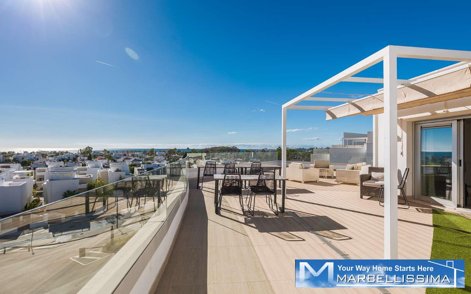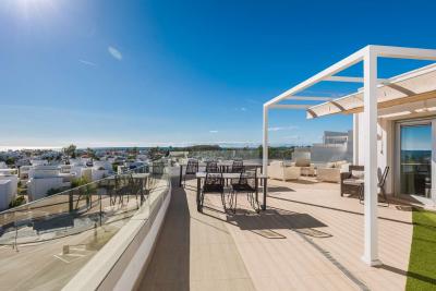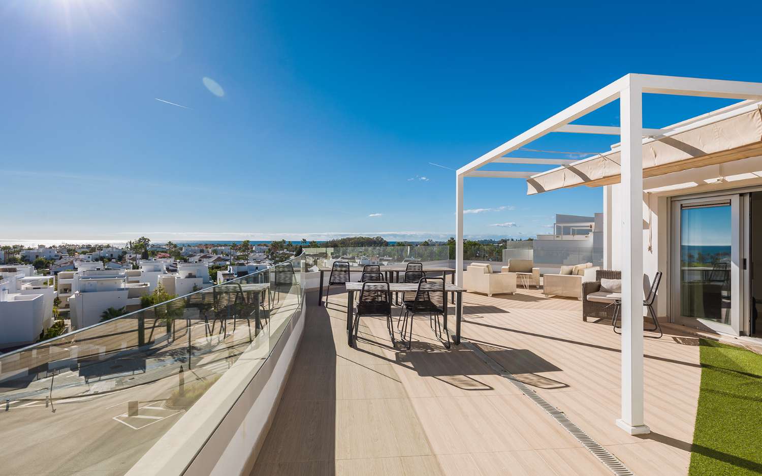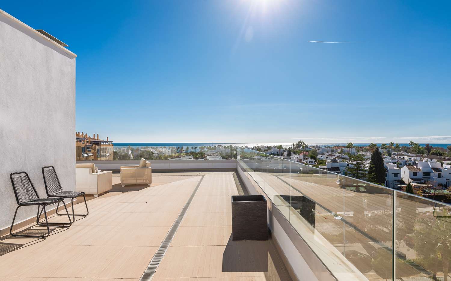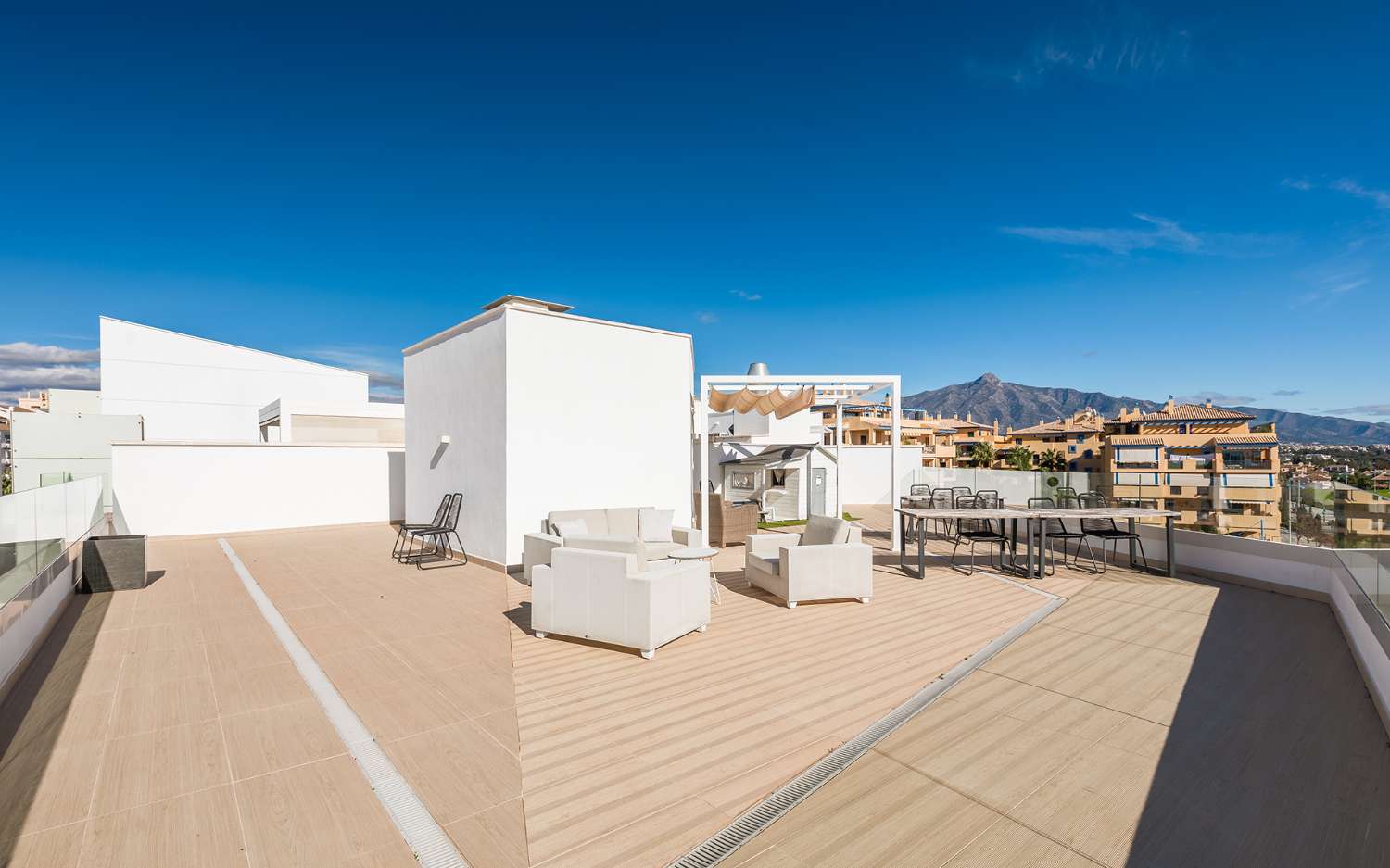 This remarkable South-facing corner duplex penthouse, is in Acqua, a luxurious residence, built in 2017, offering a leisure zones with interior green area, with gardens, outdoor swimming pool, communal walkway, communal basement with access way to private garages, lifts, and security, situated in San Pedro Playa, just 700 meters from the beach and Ideally located near the new boulevard, with diverse leisure and dining options.