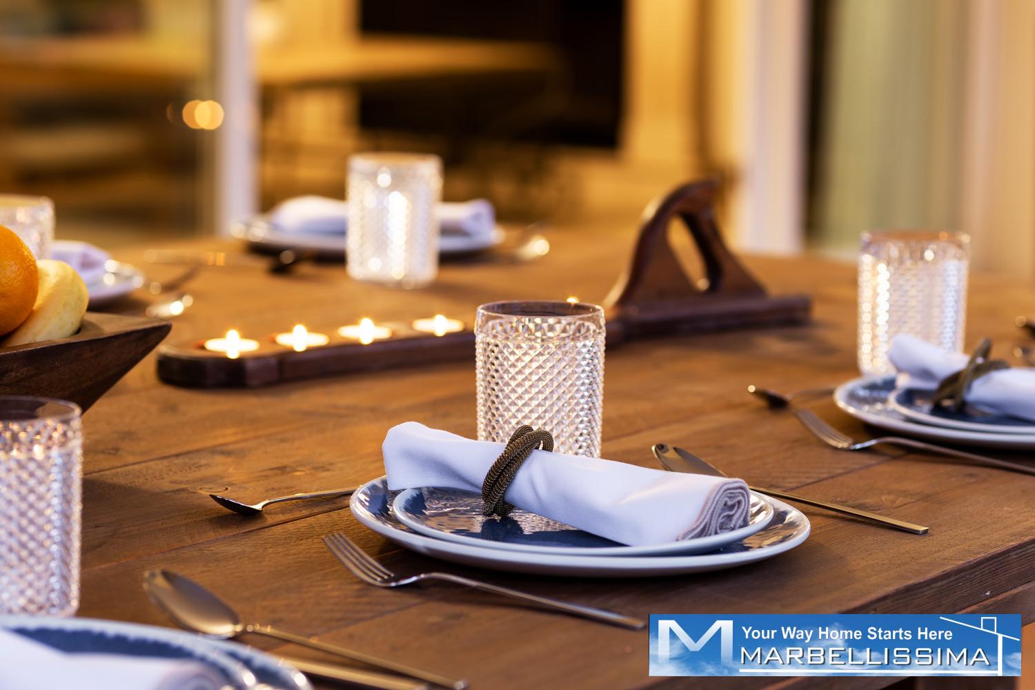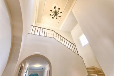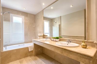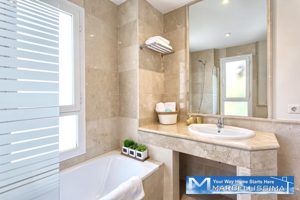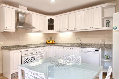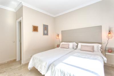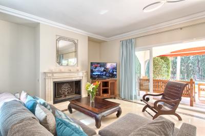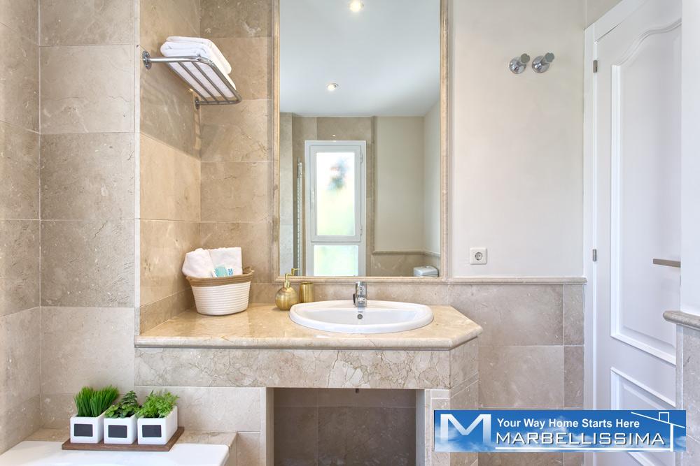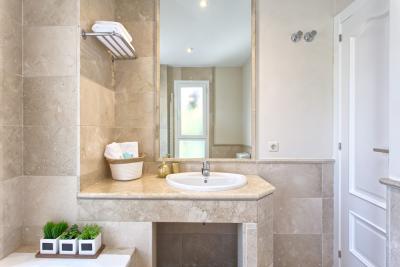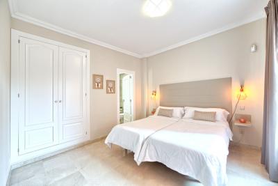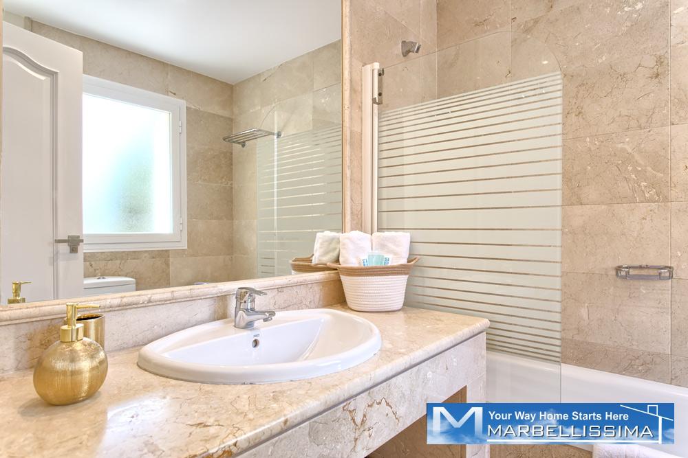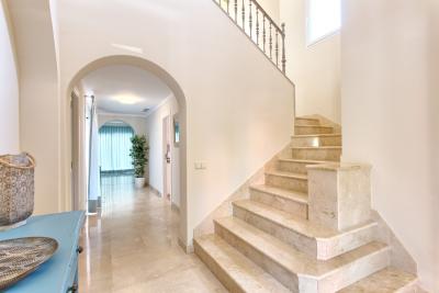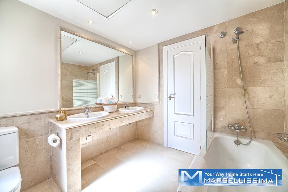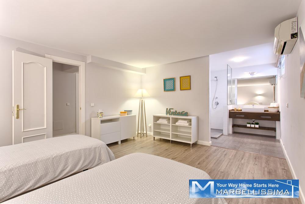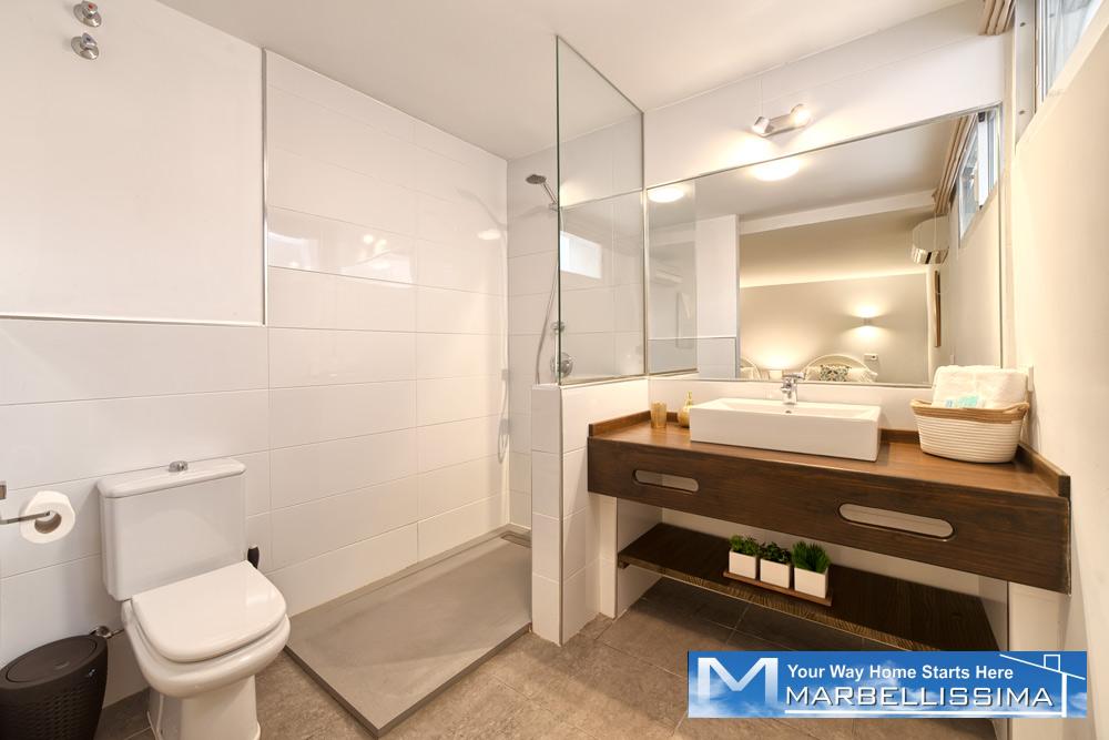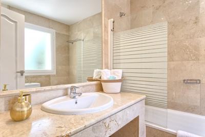 - The first floor has its own AC/Heating system for the 3 bedrooms upstairs. - 1 master bedroom with kingsize bed, 50" TV, wardrobe with wall SAFE, 1 ensuite double bathroom with separated bath and shower and access to open terrace with partial sea views.