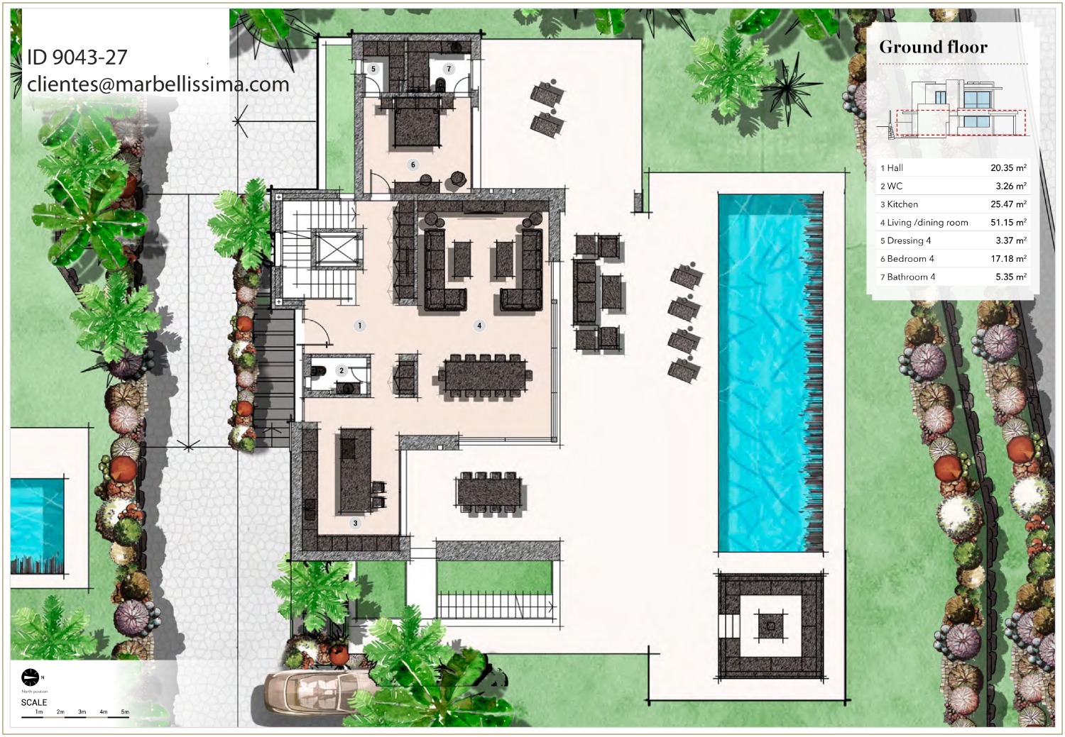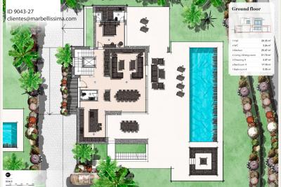 Lots of natural light. Family villa, a home in a beautiful area of Benahavis. Plenty of space and enjoy panoramic views. House of 568 m2 on a plot of 1390 m2 with 5 bedrooms en suite and 2 toilets. It is distributed in three levels. The Ground floor comprises of : Hall 20.35 m2, WC 3.26 m2, Kitchen 25.47 m2, Living - dining room 51.15 m2, Dressing room number 4: 3.37 m2. Bedroom number 4: 17.18 m2 7 Bathroom number 4: 5.35 m2.