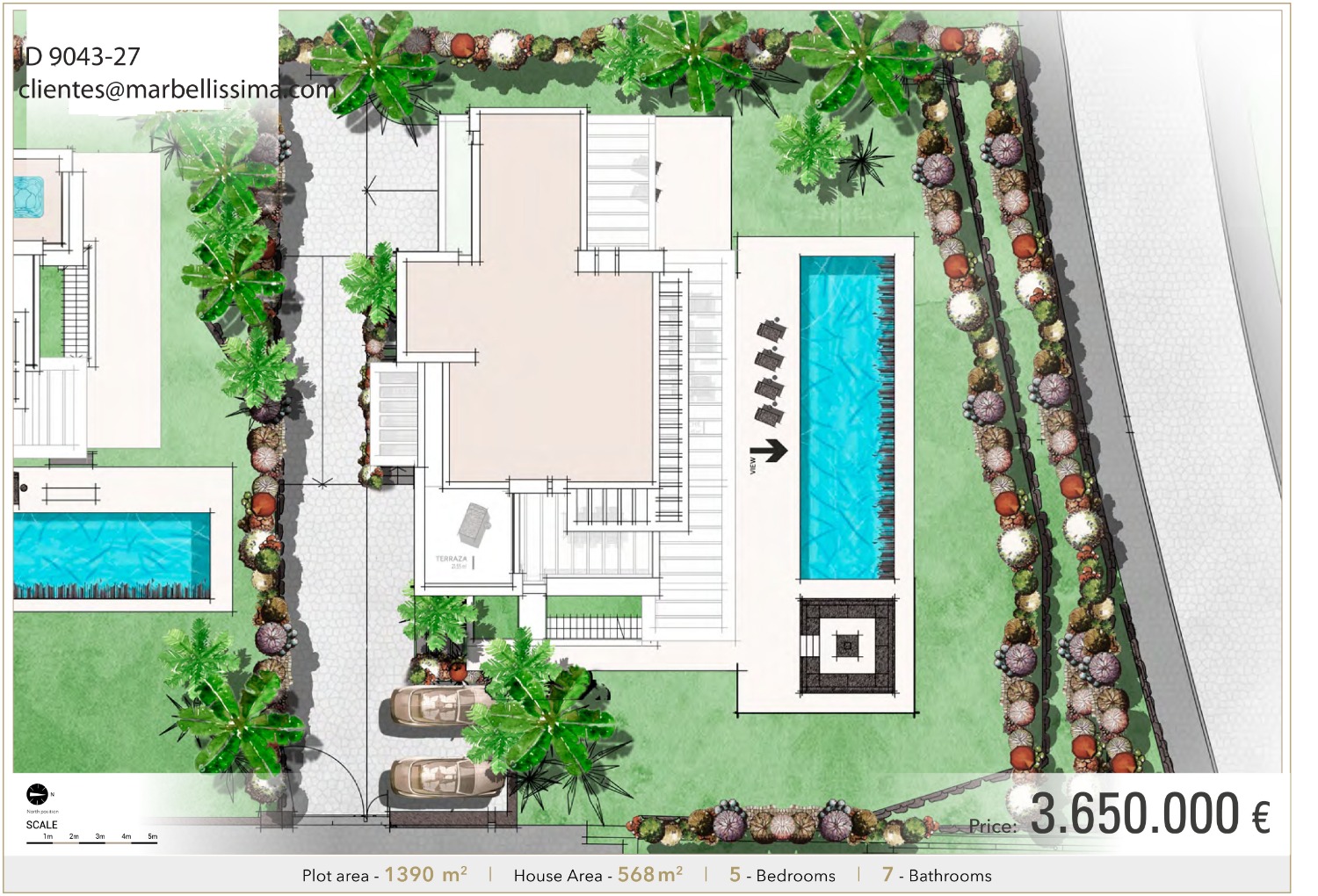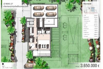 The Basement comprises of: Hall 14.45 m2, Bedroom number 5: 15.10 m2, Bathroom number 5: 4.84 m2, Dressing room number 5: 6.00 m2: Laundry room 5.15 m2, Gym 43.10 m2, Storage room 7.21 m2. Cloakroom 6.70 m2. Sauna 4.29 m2. Hammam 4.54 m2. Mech room 14.06 m2, 12 Garage 71.35 m2.
