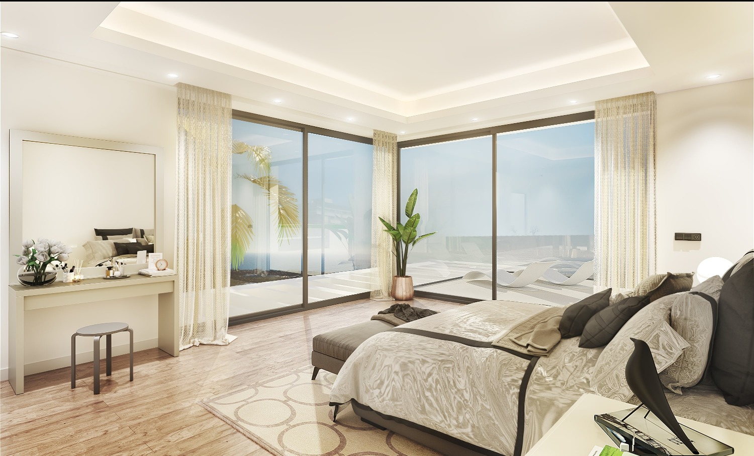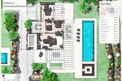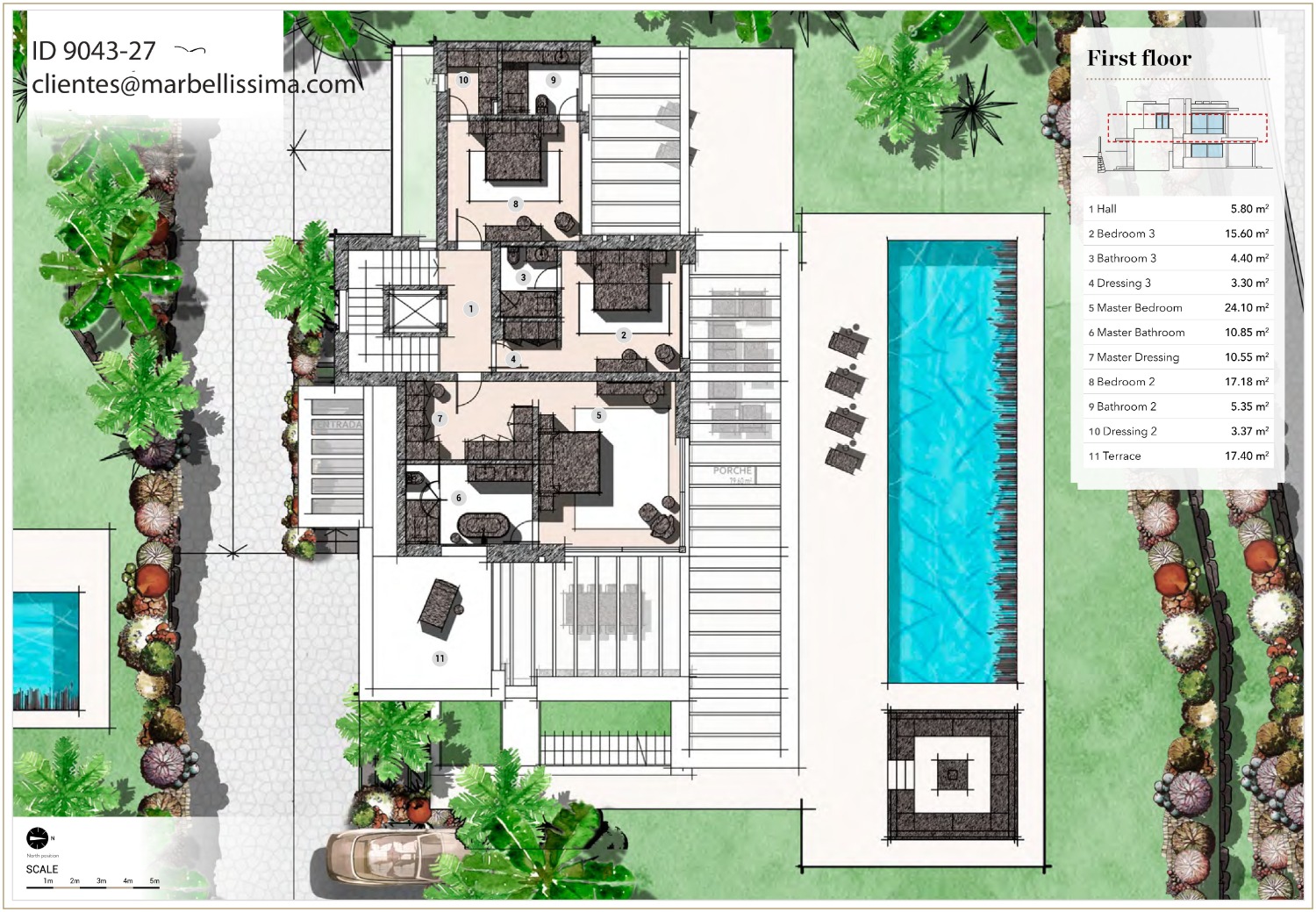 The First floor comprises of: Hall 5.80 m2, Bedroom number 3: 15.60 m2, Bathroom number 3: 4.40 m2, Dressing room number 3: 3.30 m2, Master Bedroom 24.10 m2, Master Bathroom 10.85 m2, Master Dressing room 10.55 m2, Bedroom number 2: 17.18 m2, Bathroom number 2: 5.35 m2, Dressing room number 2: 3.37 m2. Terrace 17.40 m2.