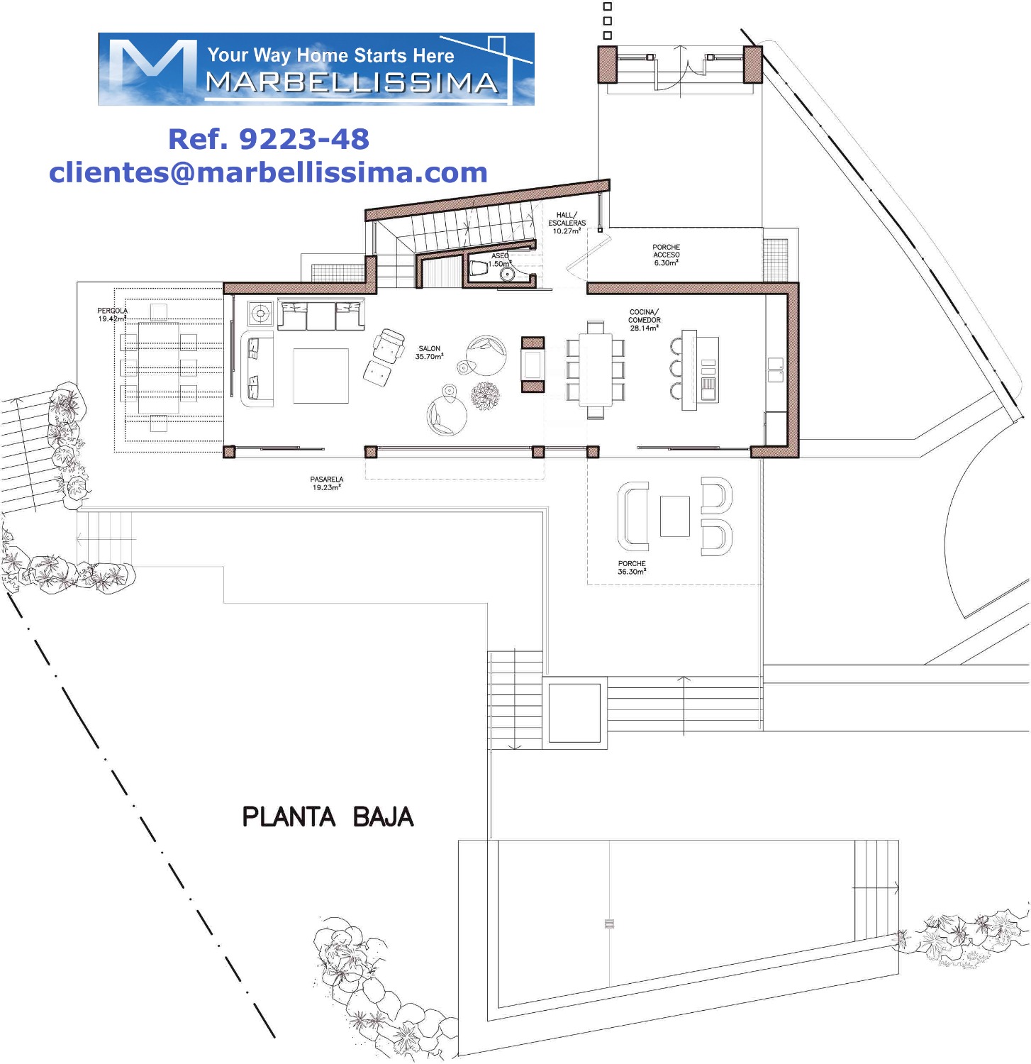 -On the Ground floor: Entrance porch, walkway of 19.23 m2 that connects the passage to the porch 36.30 m2 and the covered terrace with pergolas of 19.42 sq m, living room, toilet, kitchen style with open concept furnished and equipped.