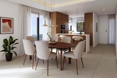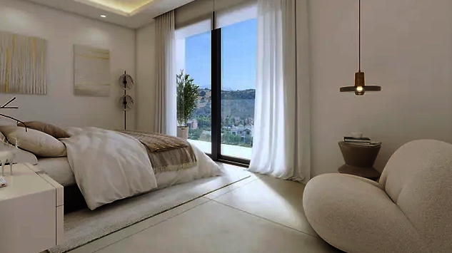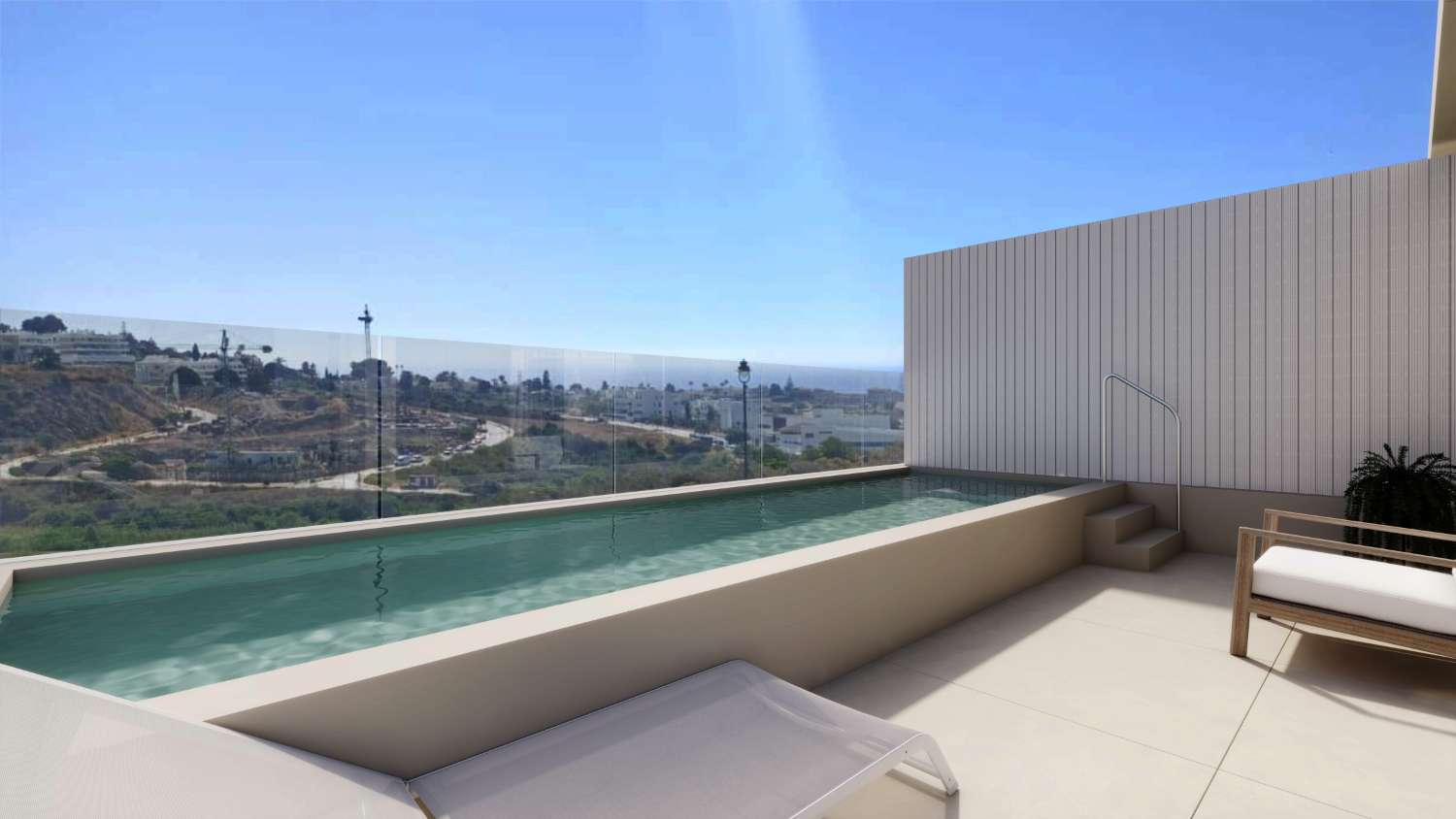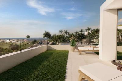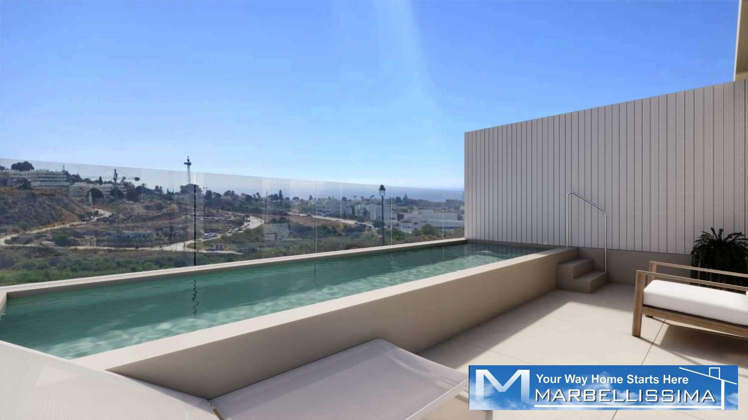 » The corners villas have their own gardens and private saline chlorination swimming pool. The central villas have the swimming pool on the roof terrace. The open and functional spaces are undoubtedly the protagonists of the houses, they connect us with the terraces and their beautiful views of the sea, golf course and mountains.