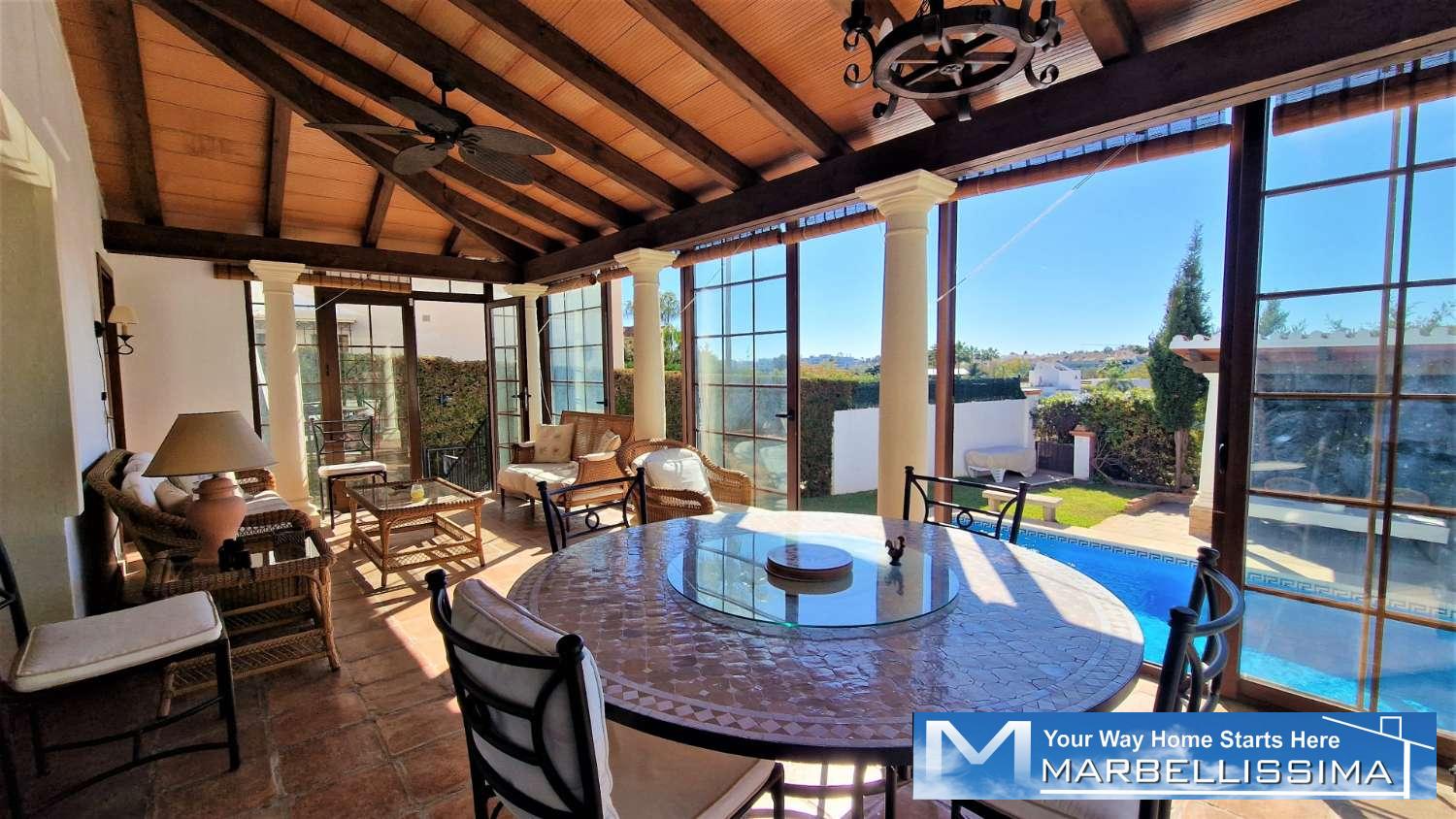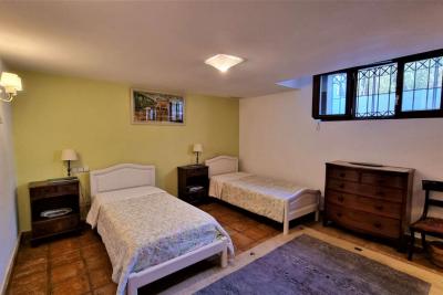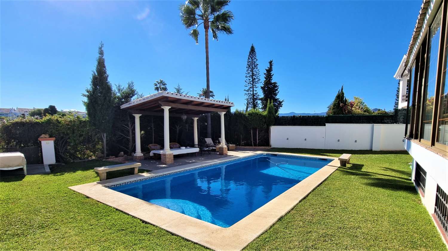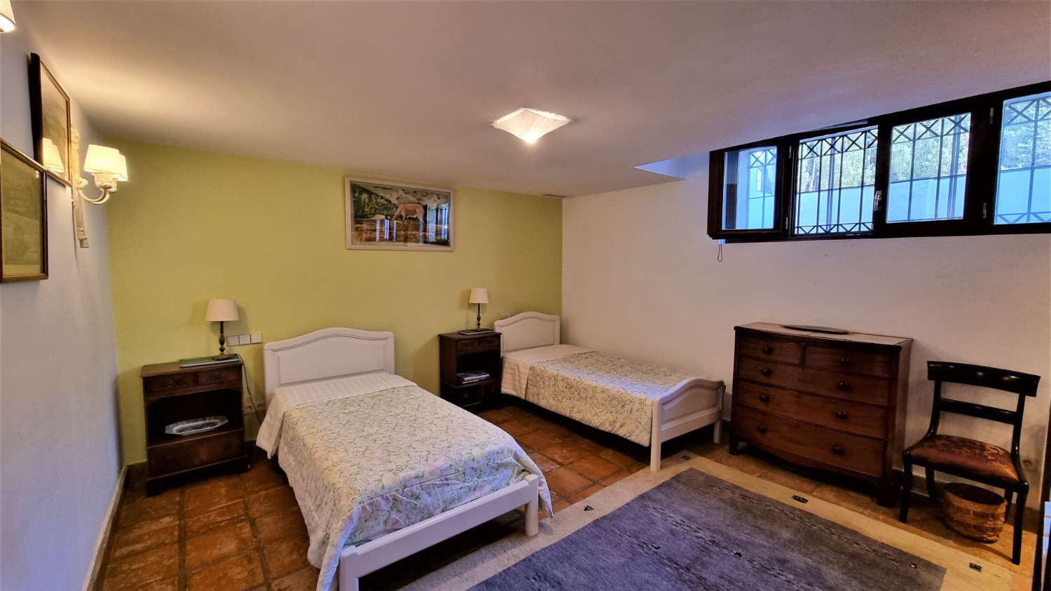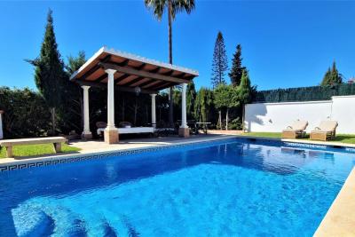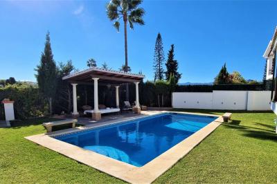 Charming house excellently located, close to the beach and all type of services. The house is built on 2 floors with a large basement. The main floor has a large living room, a separate dining room (originally a bedroom that could be re-installed), a kitchen and a guest bathroom. Communicating with the living room there is a large south-west facing conservatory with views to the pool, garden and mountains. From the kitchen there is access to an outdoor kitchen with barbecue. On the upper floor there are two bedrooms each with a balcony and sharing a bathroom. The main bedroom has a dressing room and in-suite bathroom. The basement offers 2 bedrooms, 1 bathroom, laundry room, storage room and also a large games room. There is direct access from the outside so it can be a totally independent living area.