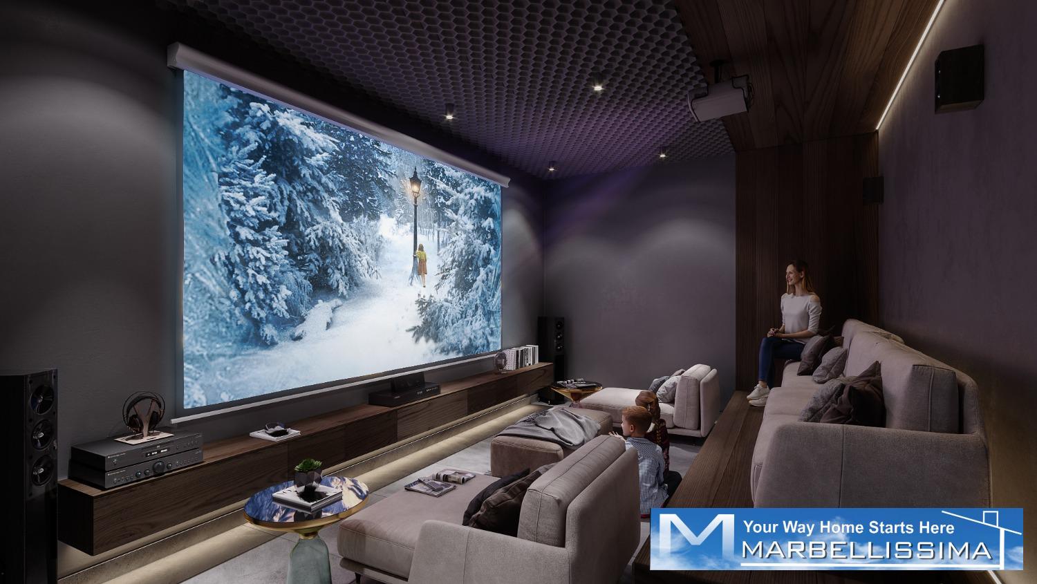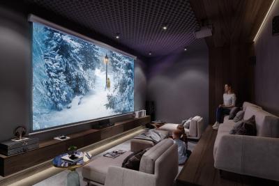 » Une salle de cinéma isolée acoustiquement avec un grand écran, un son immersif et des sièges confortables.