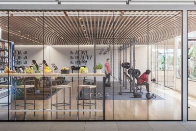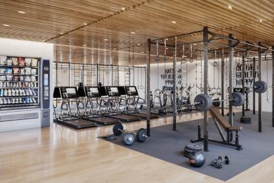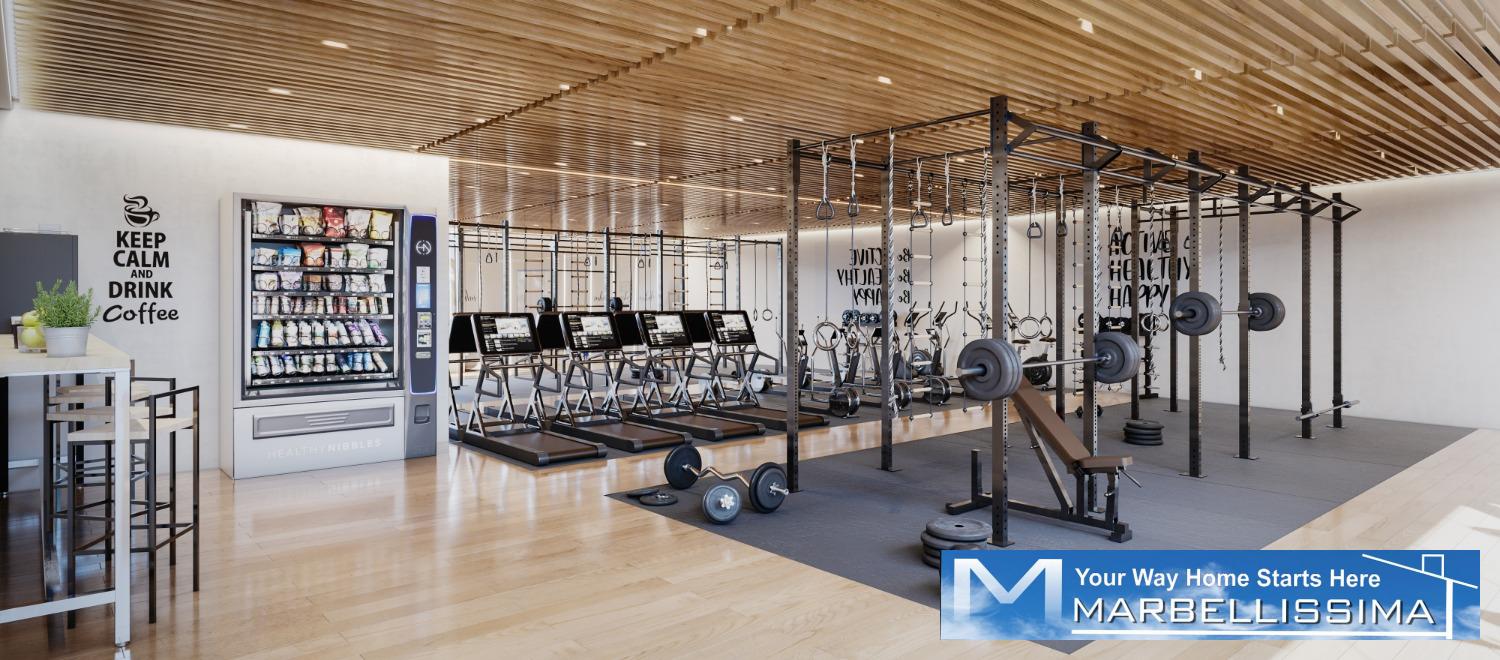» Salle de sport avec revêtement de sol technique pour éviter les blessures et rendre la pratique du sport plus agréable, tapis de course, elliptiques, vélos d’appartement, appareils de musculation et d’abdominaux, entre autres,.