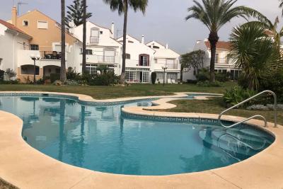 Beläget i en underbar bostad Det ligger i ett vackert samhälle av radhus, 12.000 omfattande grönområden med tropiska trädgårdar, 3 utomhuspooler, en av poolerna är uppvärmd. Detta vackra och rymliga townhouse har härlig utsikt över poolen och trädgården. Ligger på 3 nivåer med egen ingång med veranda och carport för 2 bilar. Entrén som öppnar upp mot vardagsrummet och verandan mot trädgården, köket på 20 kvm, har plats för frukostbord och det finns också en gästtoalett på denna nivå. Trappan leder till första våningen, hittar sovrummet med eget badrum, 2 stora inbyggda garderober och tillgång till en trevlig terrass med utsikt över trädgårdarna, på samma nivå finns ytterligare två sovrum ett med en liten balkong och det tredje sovrummet med terrassåtkomst, båda sovrummen har inbyggda garderober och ett det finns ett extra delat badrum med dusch. Den sista våningen är en solariumterrass med vacker utsikt över trädgården och poolen, det finns ett litet förråd på denna nivå. Bland annat marmorgolv, förinstallation av luftkonditionering, sydostlig orientering En kort bilresa till populärt område med restauranger, stränder, golfbanor, köpcentrum, Puerto Banus och Marbella stad.